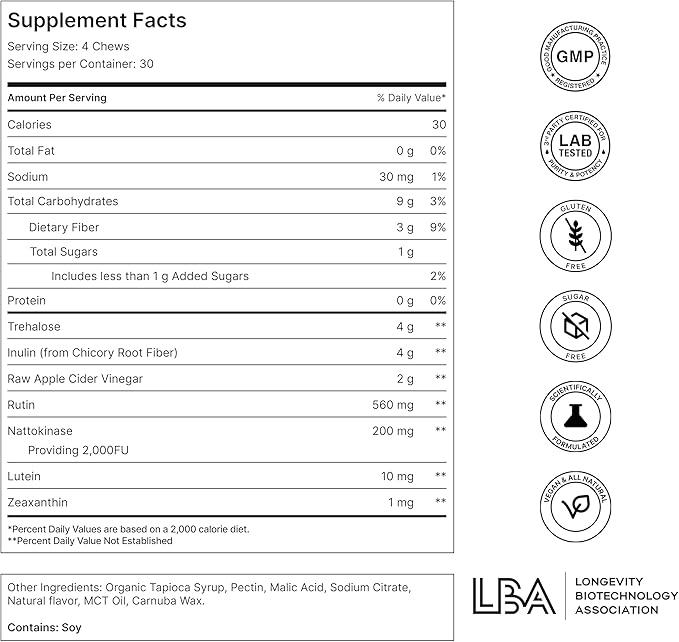 - ALL-IN-ONE CHEW: NOVOS Vital supports multiple organs by leveraging an all-in-one formulation of evidence-backed ingredients: Trehalose, Apple Cider Vinegar, Nattokinase, Rutin, Lutein, Zeaxanthin, and Inulin. NOVOS Vital is all natural, Non-GMO, vegan, high in prebiotic fiber, and does not contain unhealthy sugars, yeast, wheat, gluten, dairy, artificial sweeteners, flavors, or colors. Made in the USA.