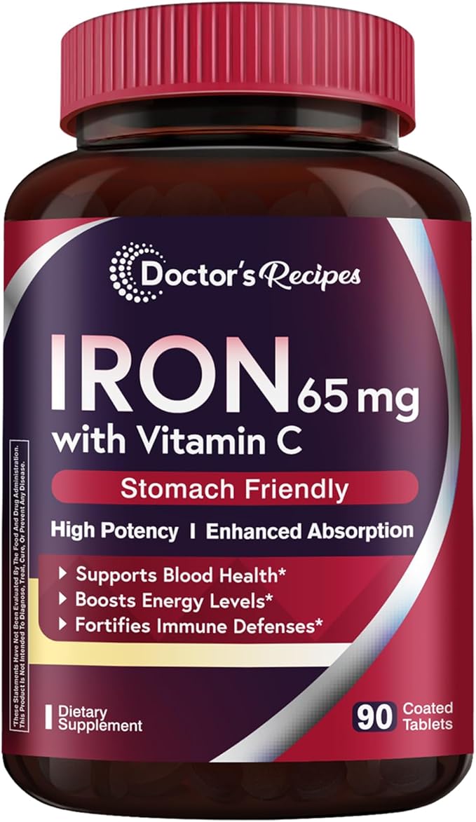 Doctor's Recipes Iron Supplement 65 mg with Vitamin C - Maximized Absorption & Stomach Friendly Iron Pills for Red Blood Cells Formation, Heart, Brain & Immunity Health - Vegan Non-GMO 90 Iron Tablets