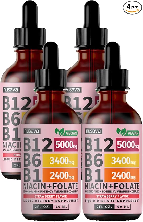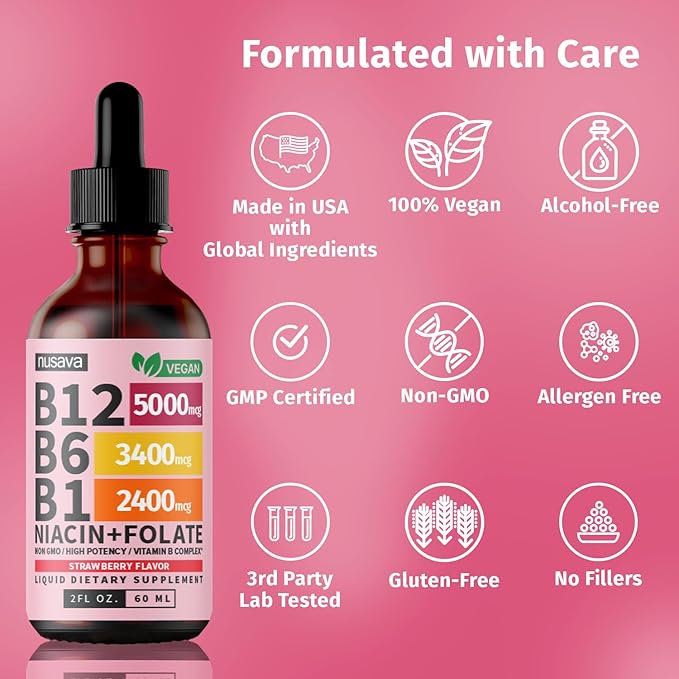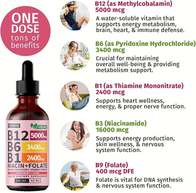 - B12 Drops Formulated for Maximum Potency - Our Liquid Vitamin B12 Drops contain Vit B12 5000mcg, B6, B1, Niacin, & Folic Acid, supporting overall body functions with 100% or more Daily Value.