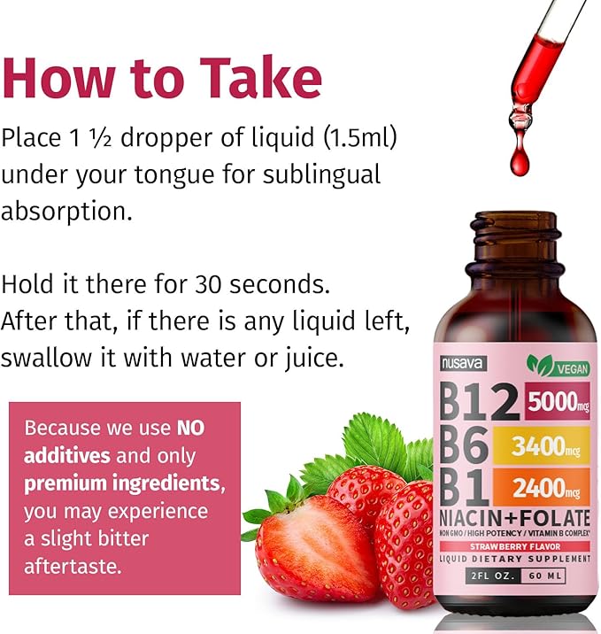 - Rapid Sublingual Absorption - Our Liquid B12 Drops are designed for efficient sublingual absorption. Just place the drops under your tongue for 30 seconds and swallow the remaining liquid. Quick and easy!