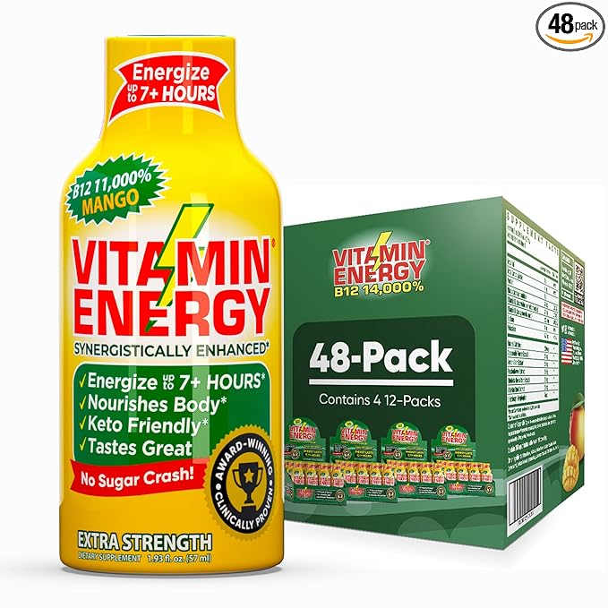 Vitamin Energy B12 11,000% Extra Strength Energy Shot Mango 48 Pack, 260mg Natural Caffeine, B12 & B6, Nootropic Focus, Vitality, Zero Sugar, Gluten-Free, Vegan, Kosher, 1.93 fl oz