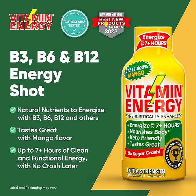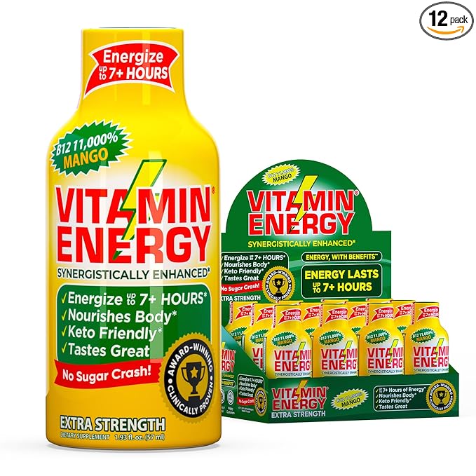 Vitamin Energy B12 11,000% Extra Strength Energy Shot Mango 12 Pack, 260mg Natural Caffeine, B12 & B6, Nootropic Focus, Vitality, Zero Sugar, Gluten-Free, Vegan, Kosher, 1.93 fl oz