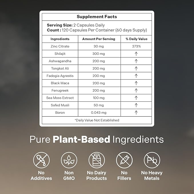- Primary Supplement Type : shilajit, ashwaghanda, tongkat ali, black maca, fadogia agrestis, boron, zinc nitrate, sea moss, safed musli shilajit, ashwaghanda, tongkat ali, black maca, fadogia agrestis, boron, zinc nitrate, sea moss, safed musli