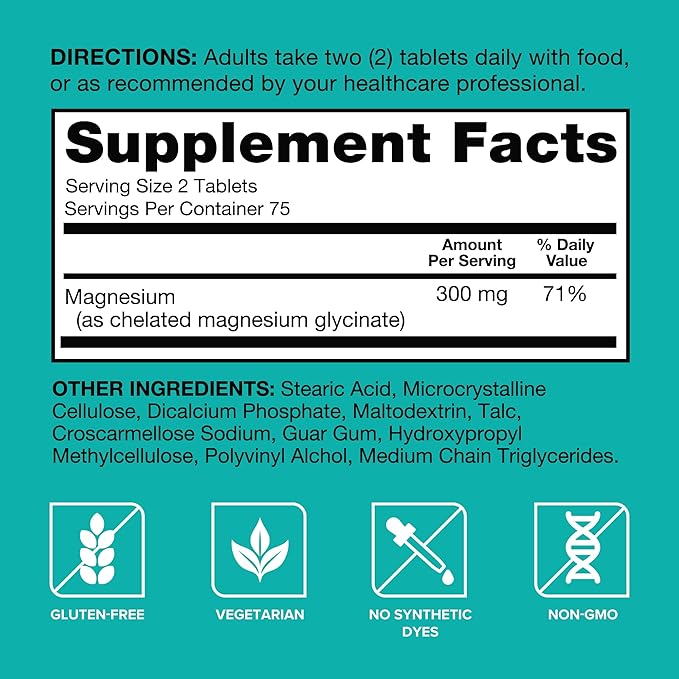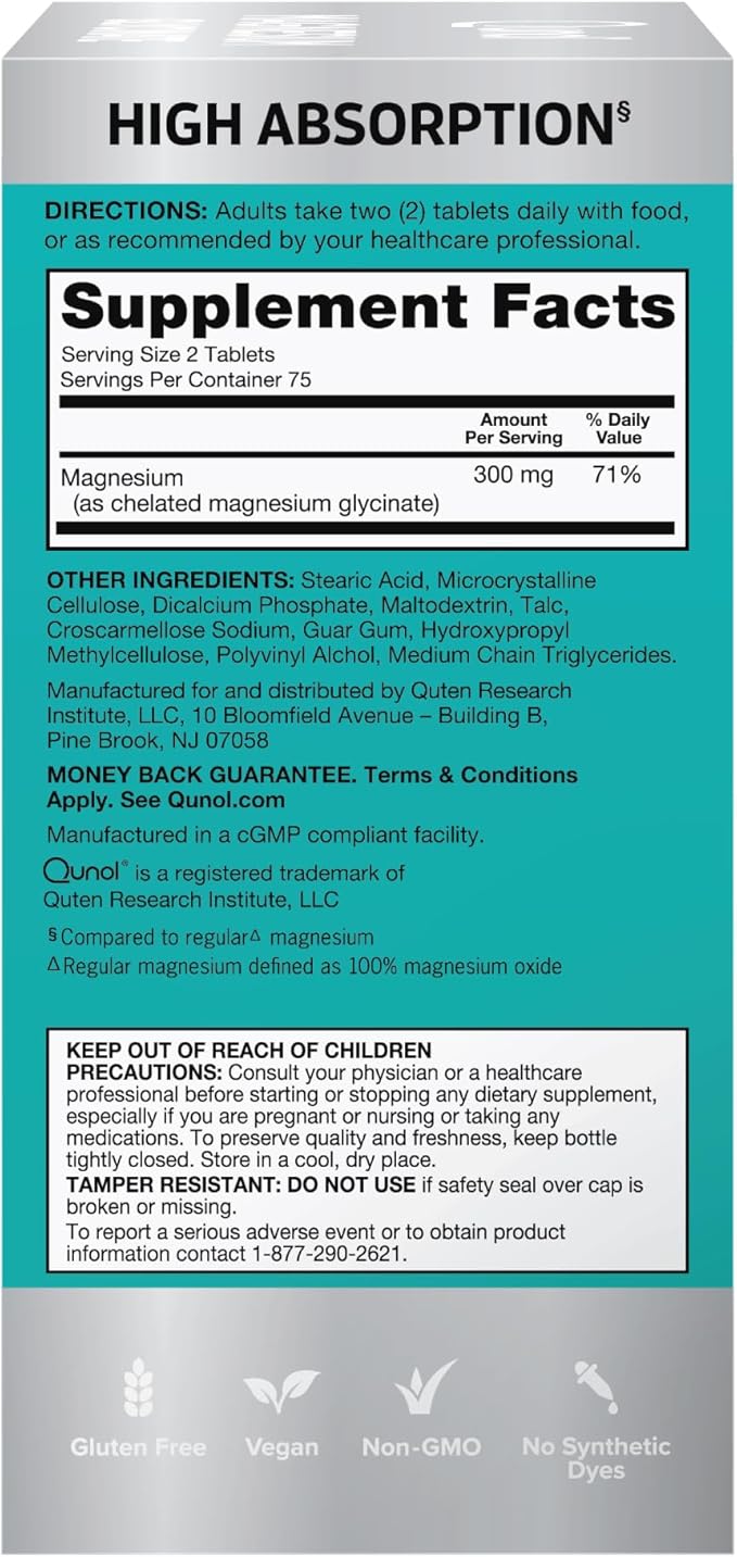 - NO ARTIFICIAL DYES OR FLAVORS - Qunol’s Magnesium Glycinate tablets are free of artificial flavors and dyes and are gluten free, vegan, and non-GMO