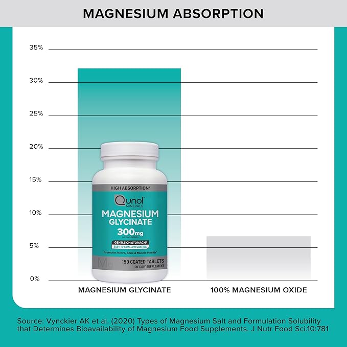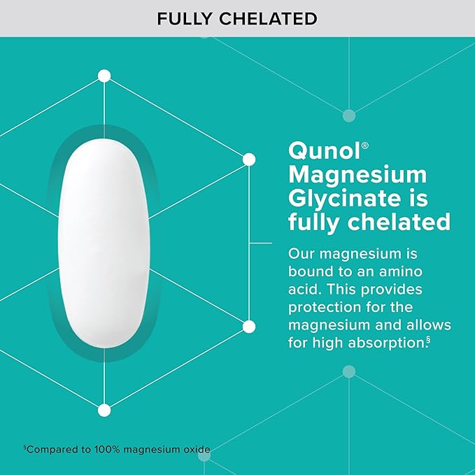 - HIGH ABSORPTION - Qunol’s Magnesium Glycinate is fully chelated, which means the magnesium is bound to an amino acid, providing a protective coating around the magnesium allowing for high absorption