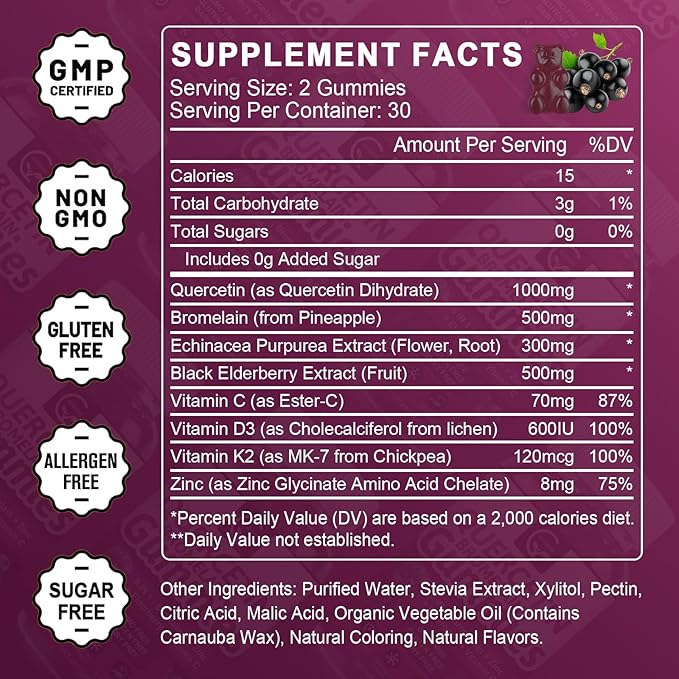 - ENCHANCED 8 IN 1 COMPLEX: Quercetin is a naturally occurring free radical scavenger that supports healthy seasonal immune system function. Our unique blend of Quercetin, Bromelain, Elderberry, Echinacea Purpurea Extract, Zinc and Vitamin C,D3,K2 offers maximum benefits. Our Quercitine Gummies is packed with over 2,378mg per serving, for lung and respiratory support. Zinc, for an extra immune and antioxidant support.
