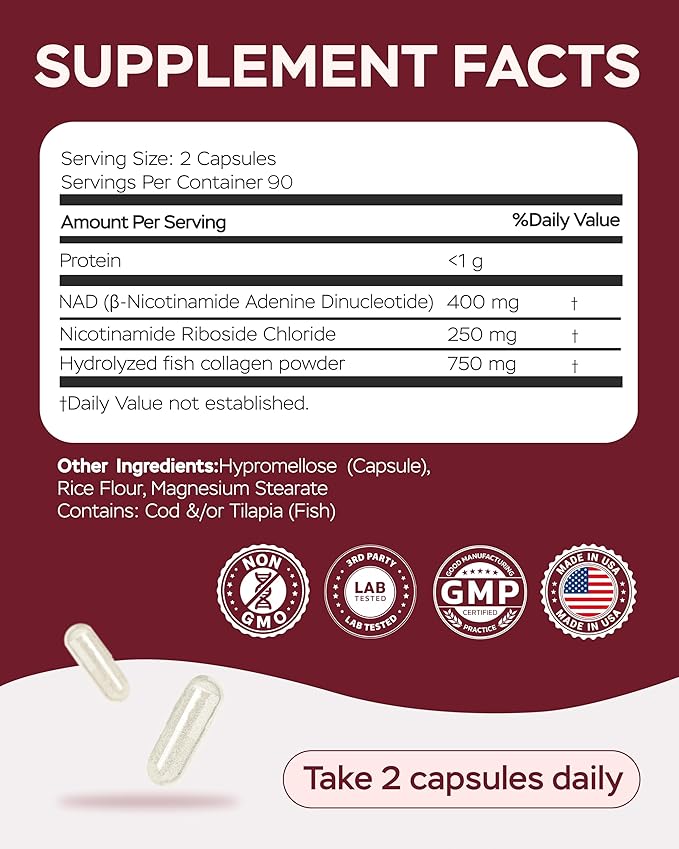 - HIGH-QUALITY 1400MG FORMULA – Each serving provides 1400mg of premium ingredients. NAD+ combined with Nicotinamide Riboside (NR) boosts cellular energy and metabolism, while collagen peptides enhance skin elasticity and tissue health.