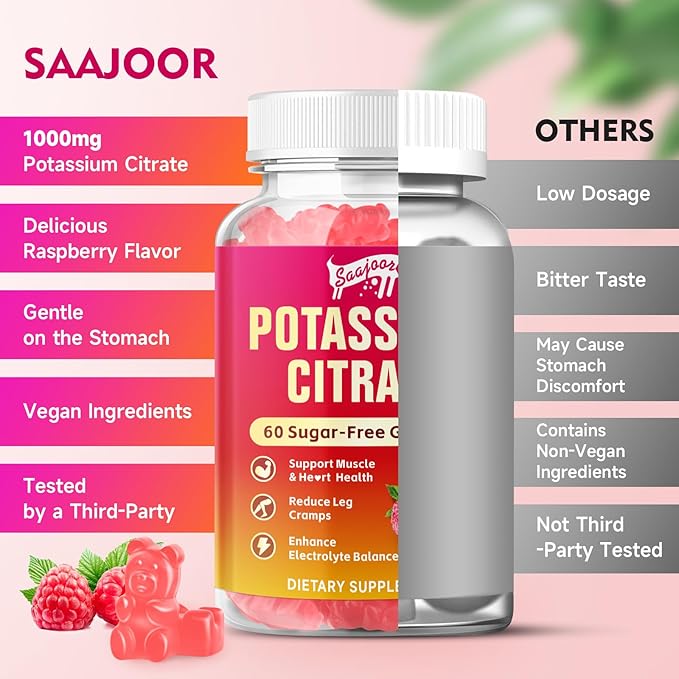 - Potassium Gummies Multiple Benefits: Incorporate these gummies into your daily routine and reap the rewards! Our potassium supplement gummies may help alleviate leg cramps, bolster muscle health, and support heart wellness. Let these gummies be your secret weapon against everyday fatigue and promote overall vitality.