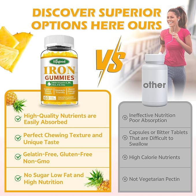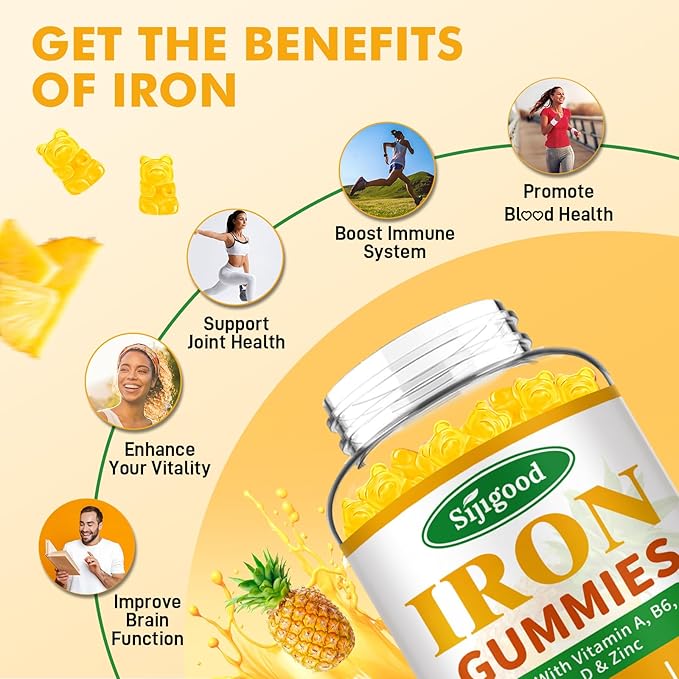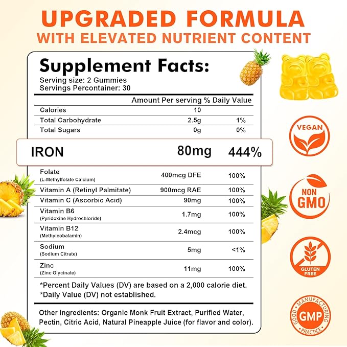 - Perfect for Iron-Deficient Individuals: These Pineapple-flavored iron gummies are sugar-free, non-GMO, gluten-free, and free from artificial additives. Gentle on your stomach with no metallic aftertaste, these iron supplements are perfect for a variety of dietary needs, including vegan and vegetarian diets. They also contain zinc for added support and vitamin C for enhanced absorption.