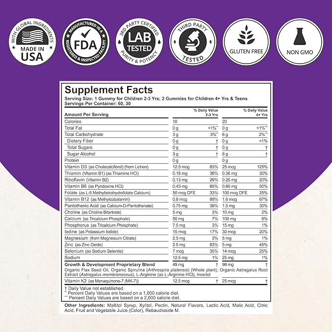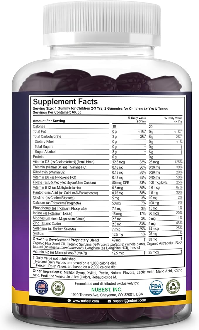 - CHOOSE HEALTHY, CHOOSE NUBEST TALL: Our kid's multivitamin gummies are free of GMO, gluten, and soy, pectin-based, vegan, and made in the USA in an FDA-registered and GMP-certified facility.