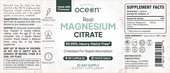 - Sourced from the Dead Sea: Real Magnesium Citrate stands out for its exceptional purity and quality. While many magnesium citrate tablets contain additives and impurities, ours is sourced from the Dead Sea, manufactured in the USA, and 3rd-party tested for optimal absorption and effectiveness. With a clean formulation, you can trust you're getting a high-quality magnesium supplement that supports your body’s needs.