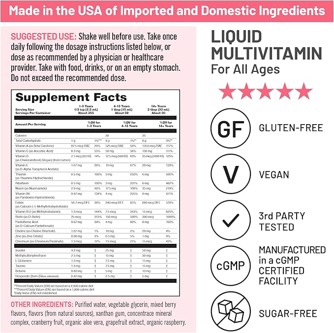 - LIQUID MULTIVITAMIN FOR ALL AGES: This delicious liquid multivitamin is easy to take every day to support energy levels and immune health. This premium multivitamin is designed for the whole family.