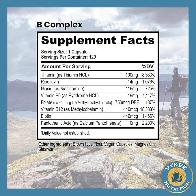 - COMPLETE B VITAMIN SUPPORT - Features a carefully balanced blend of eight essential B vitamins, including 116mg Niacin, 110mg Pantothenic Acid, 100mg Thiamin, 19mg Vitamin B6, 14mg Riboflavin, 750mcg Folate, 440mcg Vitamin B12, and 440mcg Biotin. Together, these nutrients support energy production by aiding in cellular processes like ATP synthesis and enzyme activation. This synergy ensures your cells receive the nutrients they need to function optimally, contributing to healthy cell growth, repair, and overall vitality.