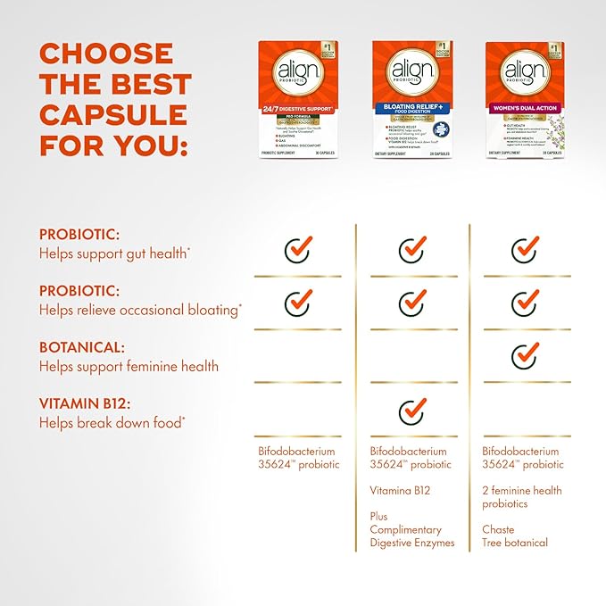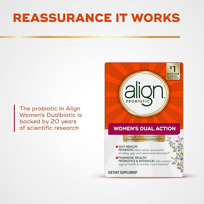 - BACKED BY SCIENCE: Align Women’s Dual Action contains the unique probiotic strain Bifidobacterium 35624, which was developed by gastroenterologists and backed by 20+ years of scientific research.