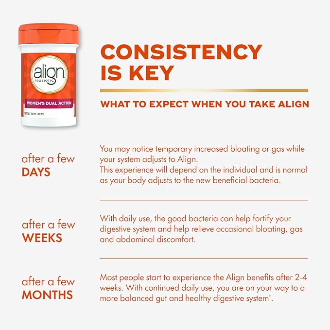 - DOES NOT CONTAIN GLUTEN AND VEGETARIAN: Align Women’s Dual Action does not require refrigeration and is enclosed in advanced packaging to ensure potency and survivability