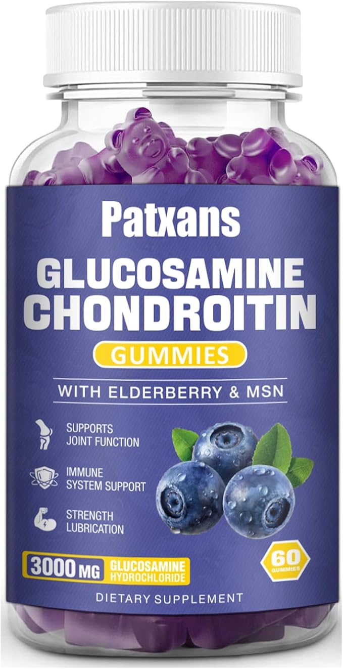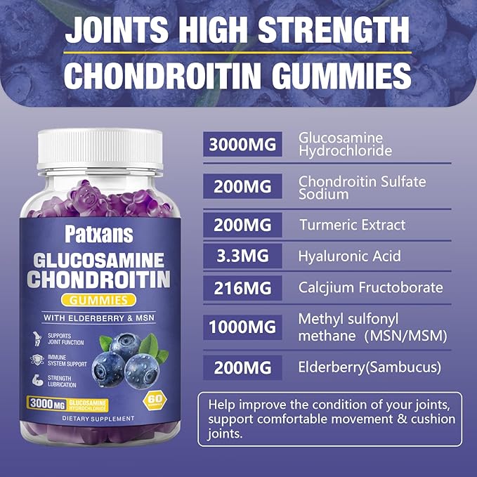 - [Why Choose Patxans]: Each Patxans glucosamine chondroitin gummies contains 3000mg glucosamine hydrochloride extract, 200mg chondroitin sulfate sodiumm, 1000mg Methyisuifonylmethane, 200mg turmeric extract, 200mg elderberry fruit, 216mcg calcium fructoborate, 3g total carbohydrate are an easy to take gummy suitable for women, men, adult. Patxans supplements gummies are pectin-based. You can incorporate them into your daily life.