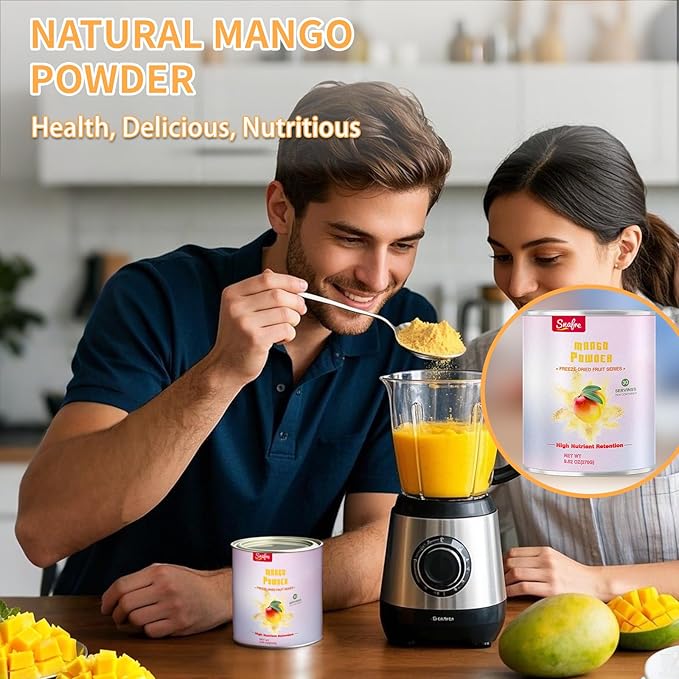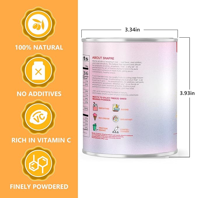 - Premium Mango Selection: Our mangoes are carefully hand-picked at the peak of ripeness to ensure that each mango is full of natural sweetness and nutrients. Through the freeze-drying process, the mangoes are carefully processed to perfectly preserve their bright color, rich tropical aroma and rich healthy nutrition. The final result is a fine and smooth mango powder without adding any additional ingredients or sugar, bringing you the pure and high-quality mango essence.