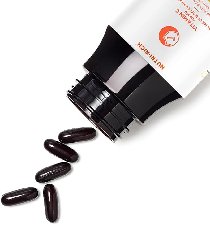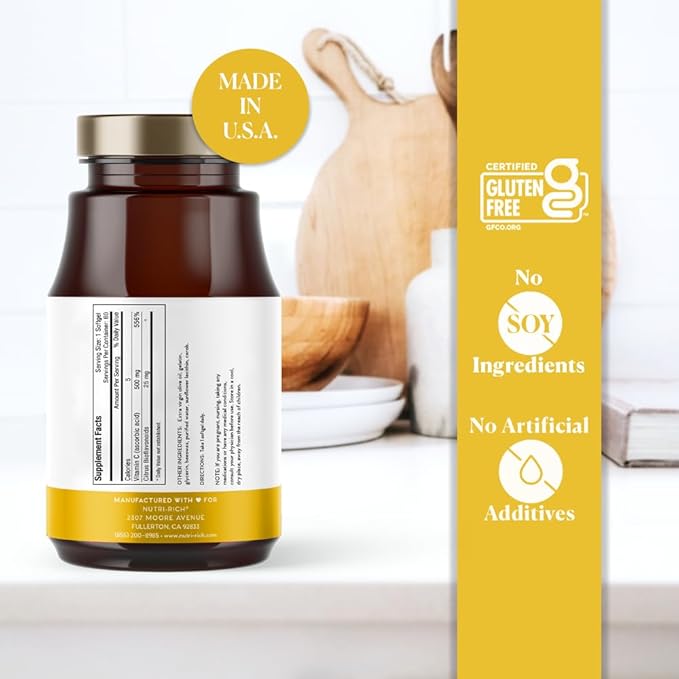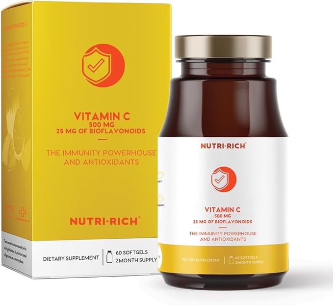 Nutri-Rich Vitamin C 500mg – Softgels with 25 Bioflavonoids – Antioxidant, Immune & Skin Health Support – Gluten-Free, Third-Party Quality Tested – 60 Count for Adults