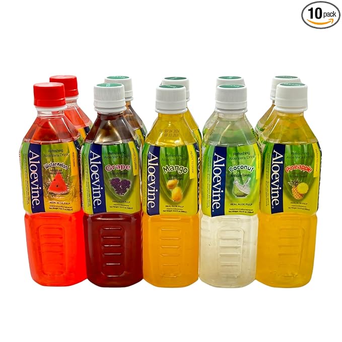Aloevine Fruity Fun Variety Pack |16.9 oz. pack of 10 l 2 watermelon, 2 grape, 2 mango, 2 coconut, 2 pineapple | plant based Vegetable Korean drinks