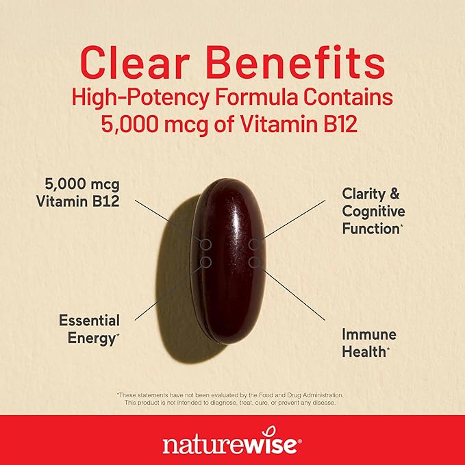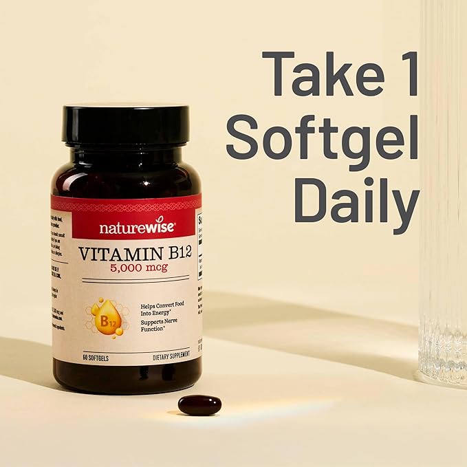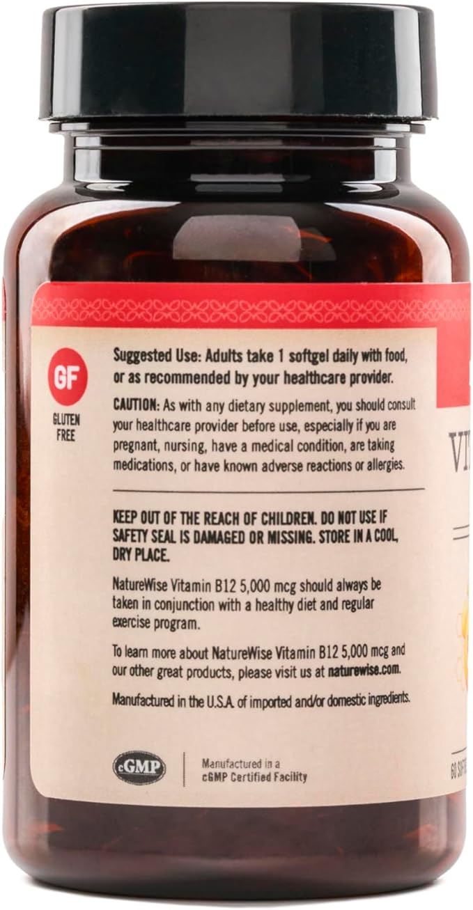NatureWise Vitamin B12 5000 mcg - Extra Strength - Supplement for Supporting Energy Levels, Mental Clarity, Nervous System Health - Easy-to-Swallow, Soy and Gluten-Free, Non-GMO - 60 Softgels