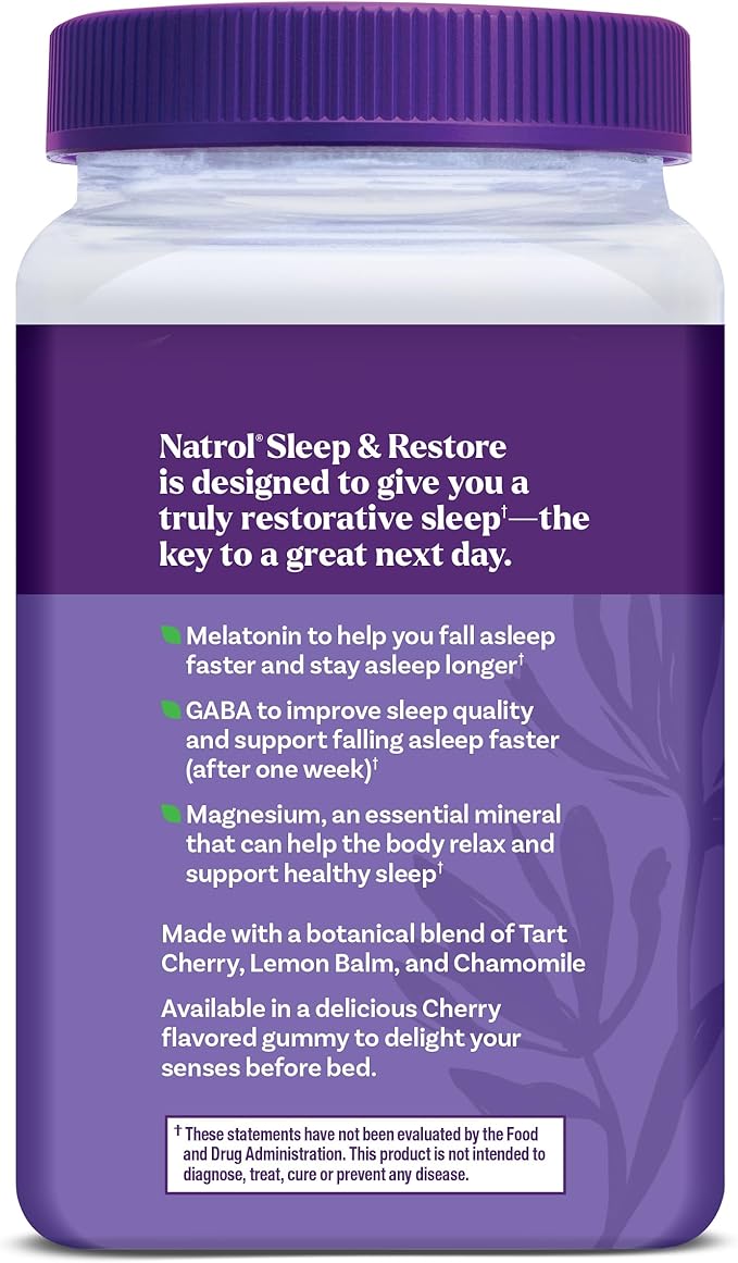 Natrol Sleep + Restore Magnesium Glycinate Blend Gummies with Melatonin 5mg - Calm Magnesium with GABA, Botanical Blend, Cherry Flavor, 60 Gummies