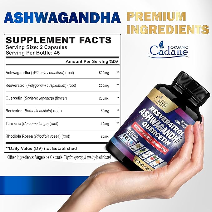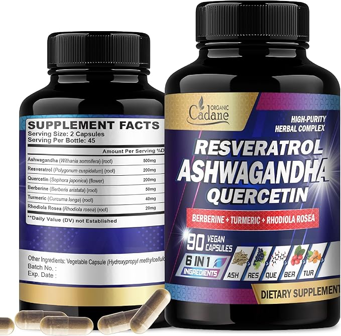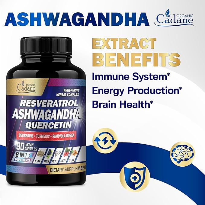 Organic Cadane Ashwagandha Supplements - 6 Premium Ingredients with Resveratrol, Quercetin, Berberine, Turmeric, Rhodiola Rosea - 90 Extract Capsules