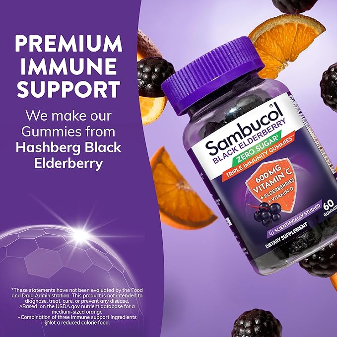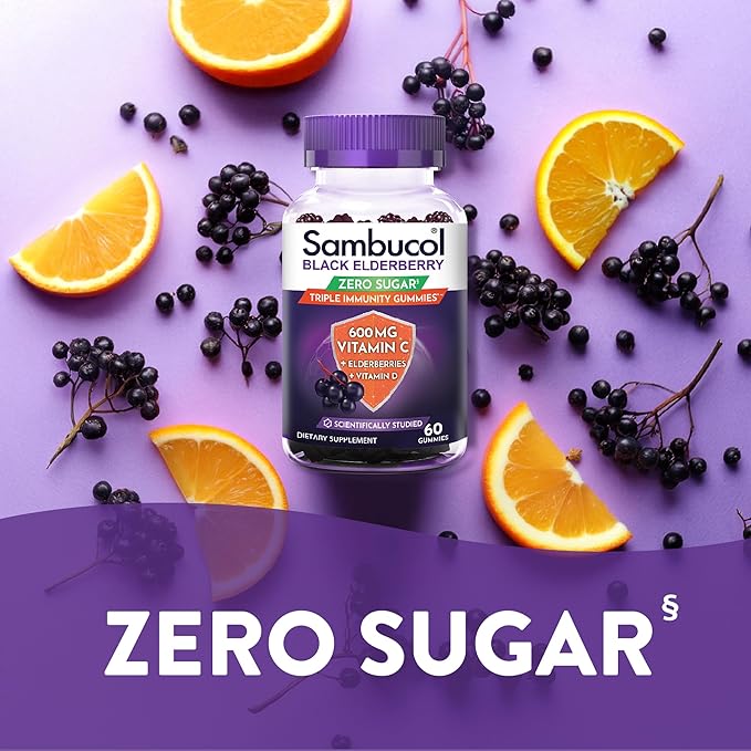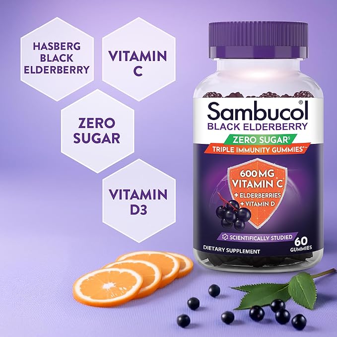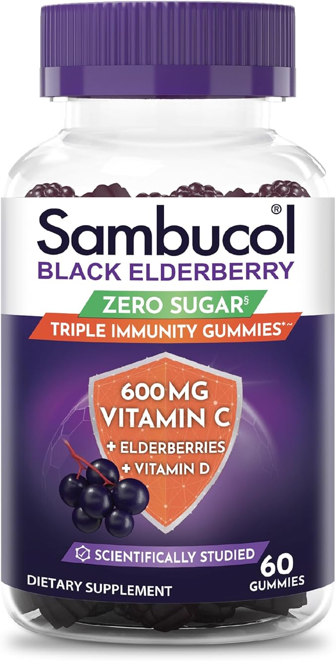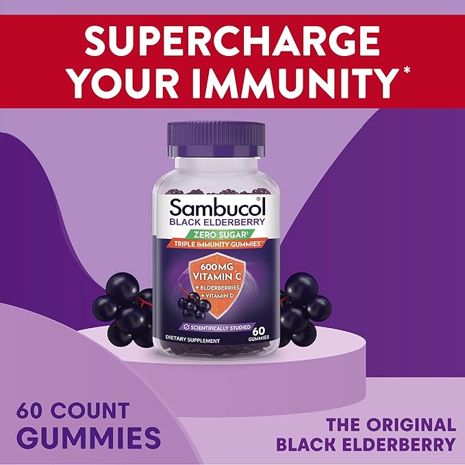Sambucol Black Elderberry Zero Sugar Triple Immunity Gummies - Black Elderberry Vitamin C Immune Support Supplement, Gummy with Vitamin D for Adults and Kids - 60 Gummies (Pack of 1)