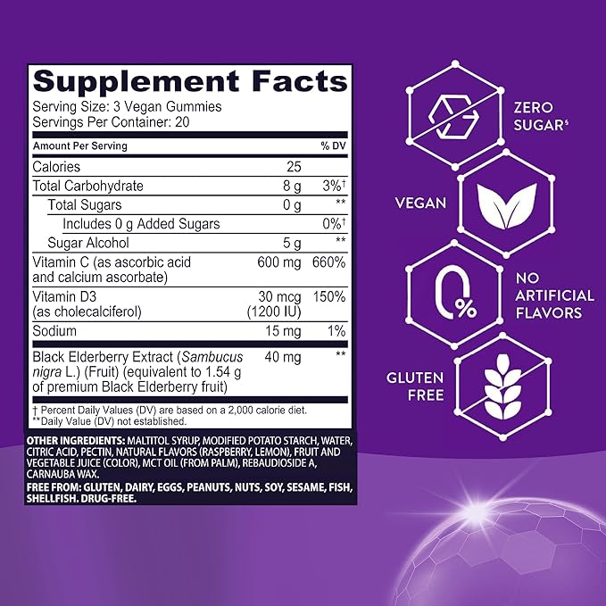 - TRIPLE IMMUNE SUPPORT GUMMIES - Packed with premium black elderberry, 600 mg Vitamin C, and Vitamin D3, these delicious Immunity gummies for men and women are an easy way to boost your immune support daily