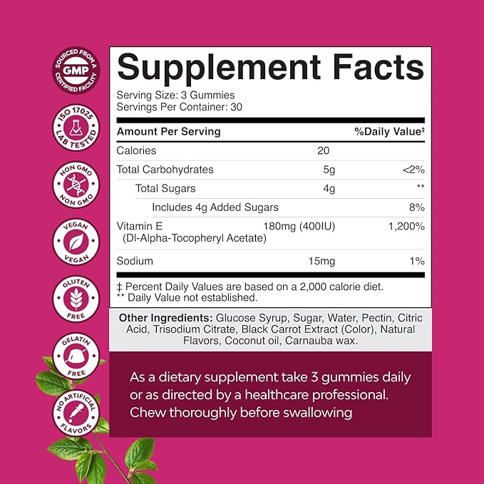 - Optimal Skin Health - Vitamin E is known for its skin-loving properties & our gummies help maintain healthy skin by supporting overall hydration and promoting a more youthful looking appearance