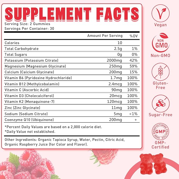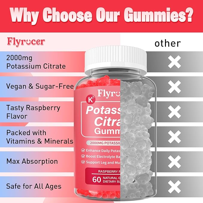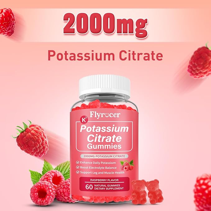 - Delicious Raspberry Flavor: Enjoy the refreshing raspberry flavor of these easy-to-chew potassium citrate gummies for adults. They are gentle on the stomach, offering a tasty and convenient way to boost your potassium levels without the aftertaste of traditional pills