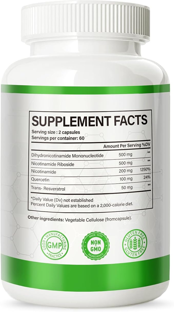NMNH (Dihydronicotinamide Mononucleotide), NMN Alternative Supplement w/Niacinamide (Vitamin B3), Quercetin, Trans-Resveratrol, Support NAD+, Skin Cell Health*, Anti-Aging & Energy, 120 Caps