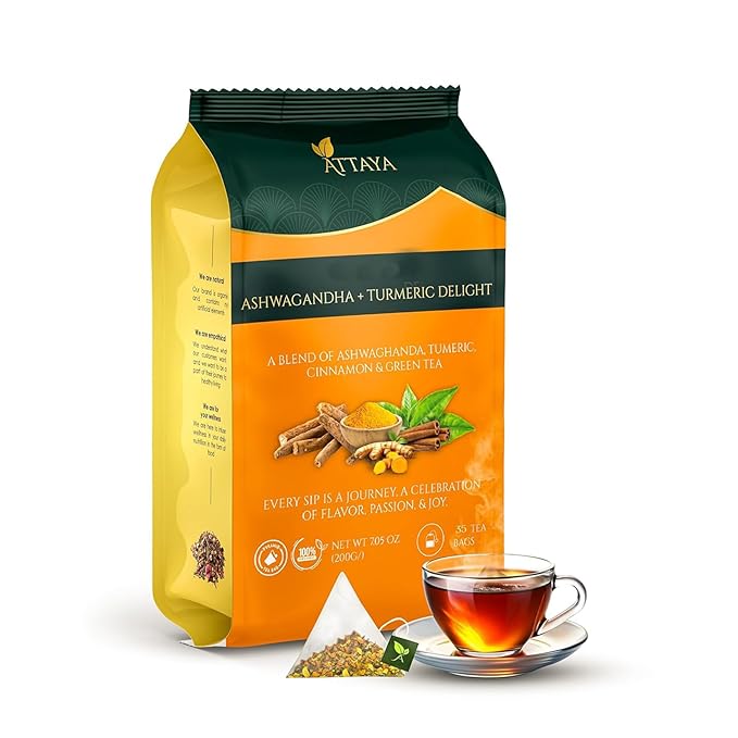 Attaya Ashwagandha Tea Bags - Ashwangandha + Turmeric Delight Tea - 35 Tea Bags -100% Herbal blend of Ashwagandha, Turmeric, Cinnamon, and Green Tea, 2.47 oz (70g)