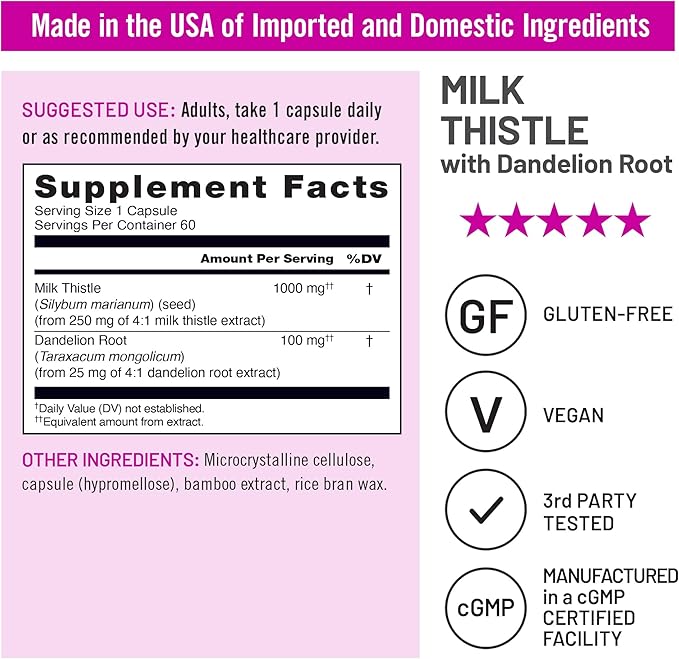 - HIGH POTENCY MILK THISTLE & DANDELION ROOT: Each capsule delivers the equivalent of 1,000 mg of milk thistle (from 250 mg of 4:1 extract) to provide potent liver support and the equivalent of 100 mg of dandelion root (from 25 mg of 4:1 extract) for additional benefits.*