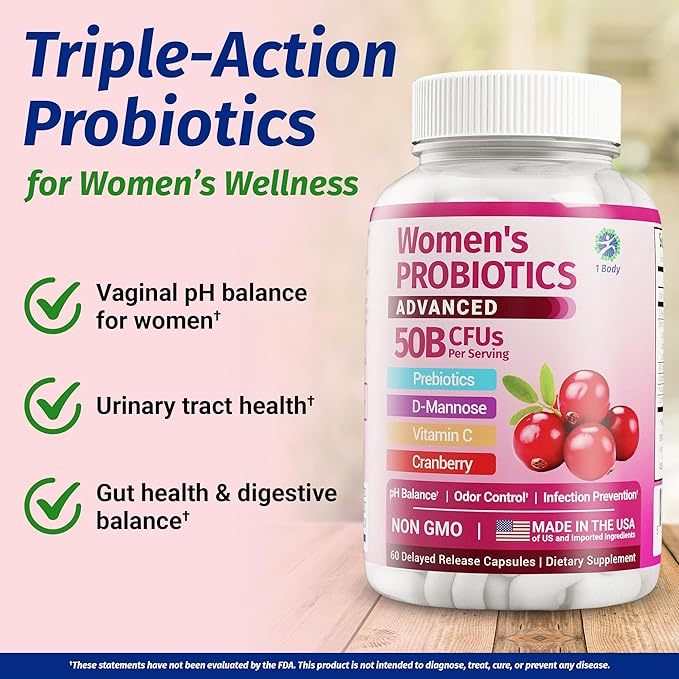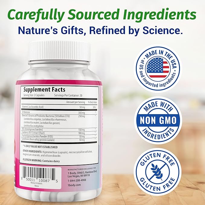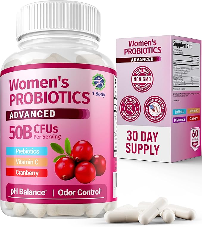 1 Body Probiotics for Women with 50 Billion CFU, Vaginal Probiotics with Prebiotics, Cranberry, D-Mannose & Vitamin C, Vaginal Pills for Microbiome Balance, Digestive & Immune Support, 60 Capsules