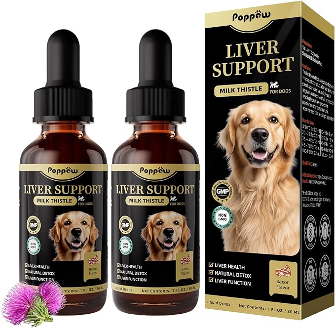 (2 Pack) Poppaw Milk Thistle for Dogs, 9-in-1 Liver & Kidney Support Drops with Artichoke, Resveratrol, Marigold Extract, Natural Detox Herbal Supplement for Liver Function, Bacon Flavor, 2 Oz