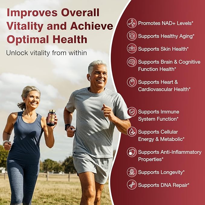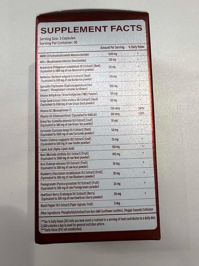 - 19-In-1 Advanced Formula - Our NAD+ resveratrol supplement features a powerful blend of 19 ingredients. This unique NMNH formula helps support healthy aging and cellular health with 100mg of NAD+ and 250mg of Quercetin. It supports brain health with antioxidants like resveratrol and lipoic acid, helping maintain cognitive well-being. The formula helps support immune health with vitamin D3, curcumin, and fisetin, while promoting overall heart health with berberine, vitamin K2, and pomegranate