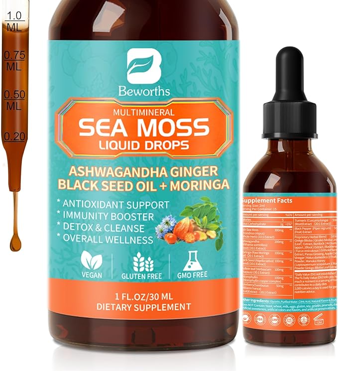- Easy-to-Take & Faster Absorption ---- Sea Moss Drops liquid chlorophyll blend seamlessly into water, tea, smoothies, or juice with a mild, natural flavor. Perfect for adults and kids(14+), these alcohol-free sea moss drops ensure effortless nutrient. Just wild-harvested Sea Moss with organic black seed oil, ashwagandha, moringa, chlorophyllin, manuka honey and bladderwrack ingredients for effective daily use.