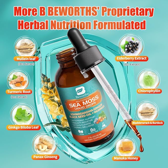 - Radiant Beauty Boost --- B BEWORTHS sea moss infused with chlorophyll, turmeric, black seed oil to enhance hair, skin, and nails for a youthful, glowing appearance. Irish Sea Moss 102+ marine minerals for skin elasticity to beauty and wellness support, and daily vitality for both men and women. In addition, Mullein & Sea Moss Lung combine a powerful herbal fusion of Irish sea moss, mullein leaf, elderberry designed to support respiratory health, boost immunity. Try sea moss liquid drops today and nourish your way to a radiant glow!