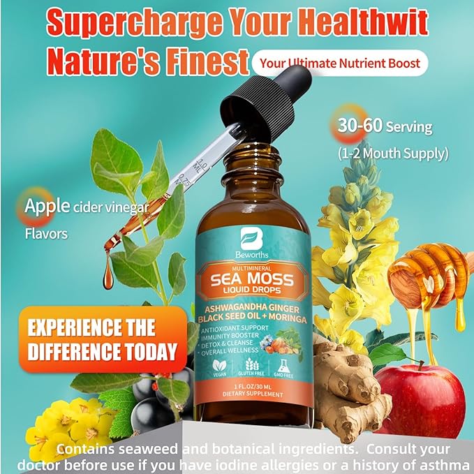 - Why Choose B BEWORTHS Seamoss Supplement? ---The Ultimate All-in-One irish sea moss chlorophyll supplement for the whole family! Whether you need Sea Moss for hair growth, black seed oil for immunity, or Ashwagandha for stress, MultiMin102 sea moss liquid drops cover it all! Vegan, gluten-free, and non-GMO, making it the smartest way to fill nutritional needs daily seamoss supplment.