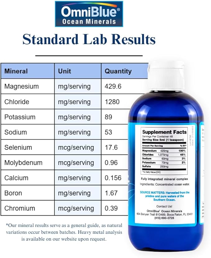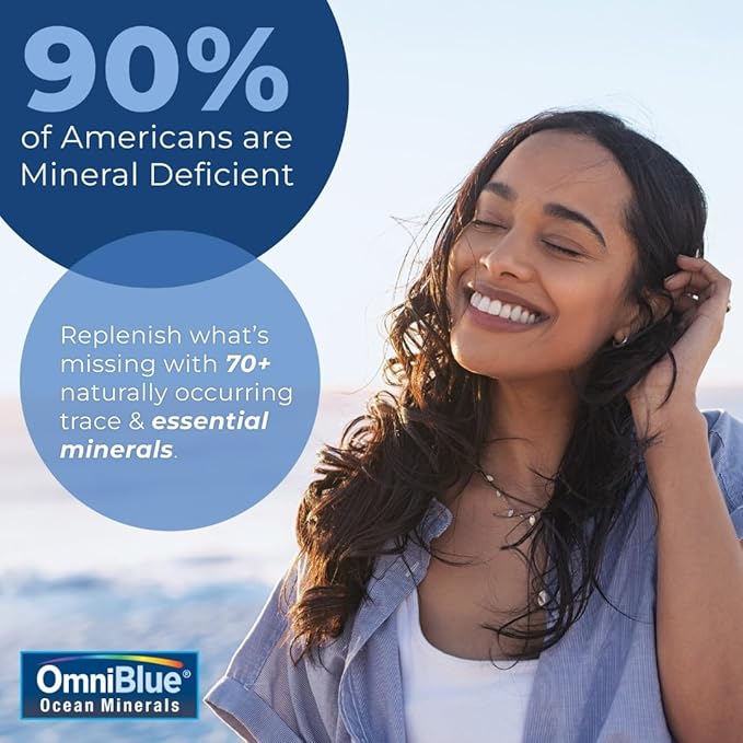 - COMPLETE OCEAN MINERALS: OmniBlue Original is harvested from deep ocean water, concentrated through solar evaporation creating a potent, bioavailable liquid packed with 420mg of ionic magnesium and over 70 essential trace minerals and electrolytes.