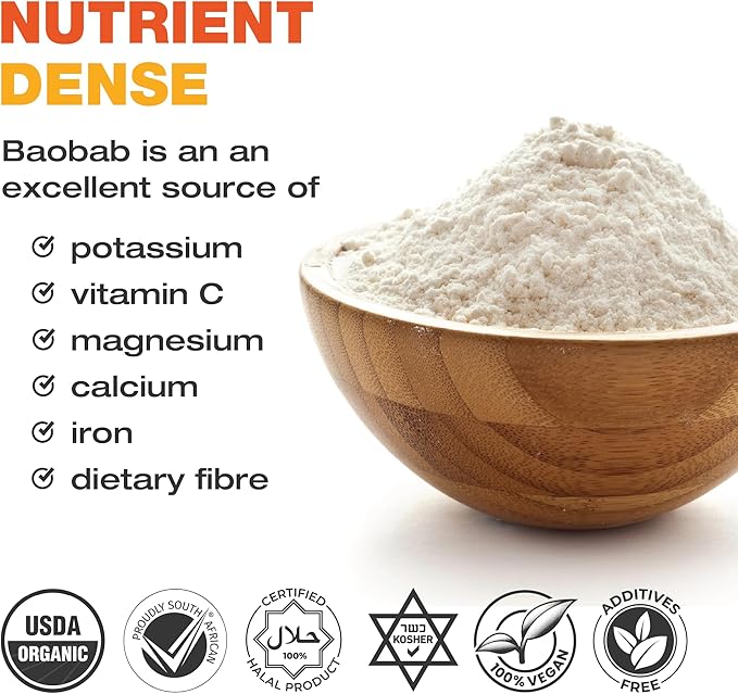 - BENEFITS: Baobab promotes optimal gut health, enhances satiety, and strengthens the immune system with its high vitamin C content. This nutrient-dense superfood is rich in vitamins, minerals, antioxidants, and dietary fiber, offering a wide range of health benefits.