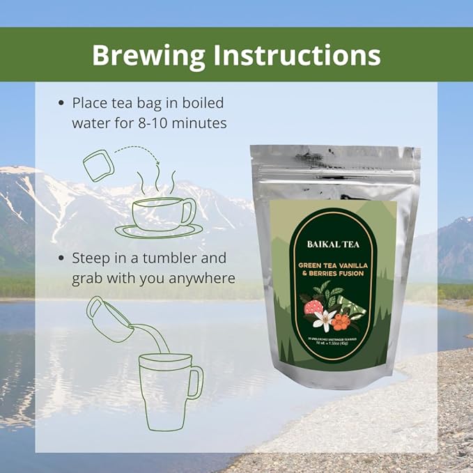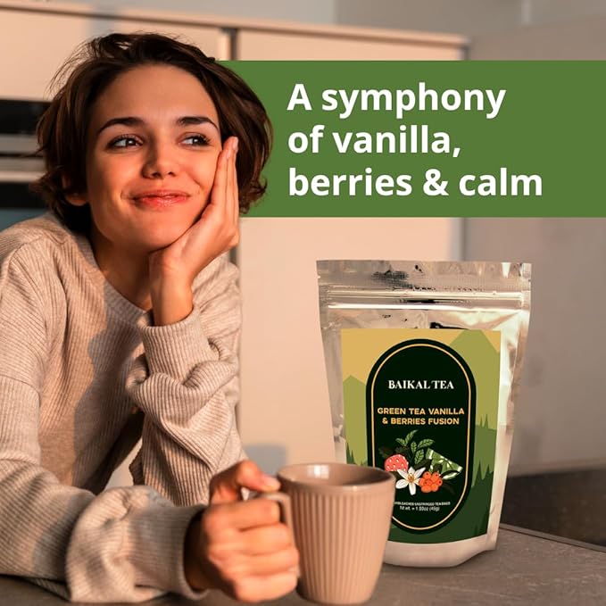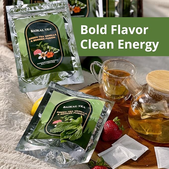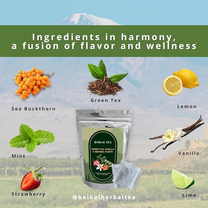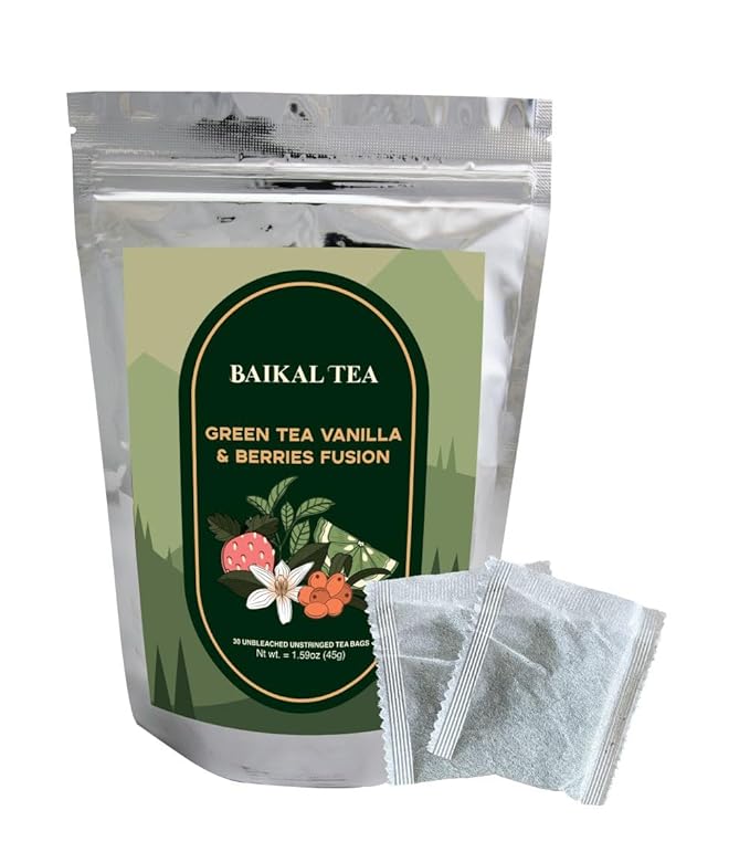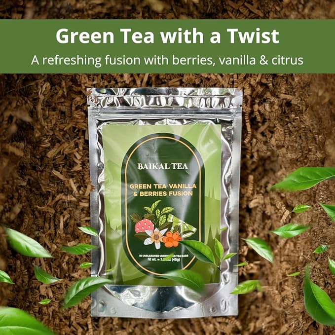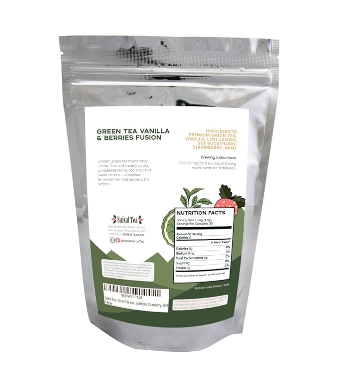 Baikal Tea Green Tea Vanilla & Berries Fusion – Antioxidant-Rich Herbal Blend with Sea Buckthorn, Lime and Mint – Fruity & Smooth Flavor, Caffeine Boost – 100% Natural 30 Tea Bags