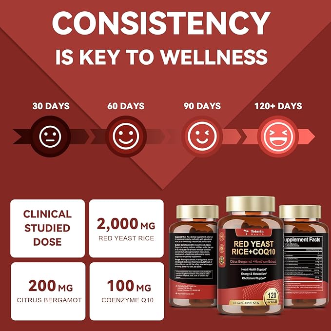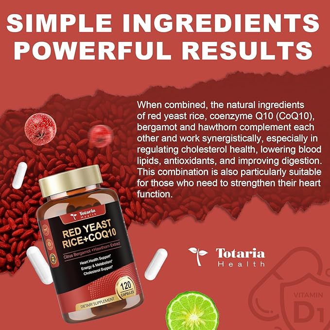 - Safer with CoQ10 - Coenzyme Q10 is the powerhouse of the body's cells, and a severe deficiency of Co-enzyme Q10 can be harmful to the heart and other organs, therefore, it is recommended to supplement with Coenzyme Q10 along with your intake of red yeast, and the Totaria Red Yeast Rice Supplement contains up to 100mg of Coenzyme Q10, which supports your body's natural energy production process, allowing you to go about your daily life with Vitality and stamina.