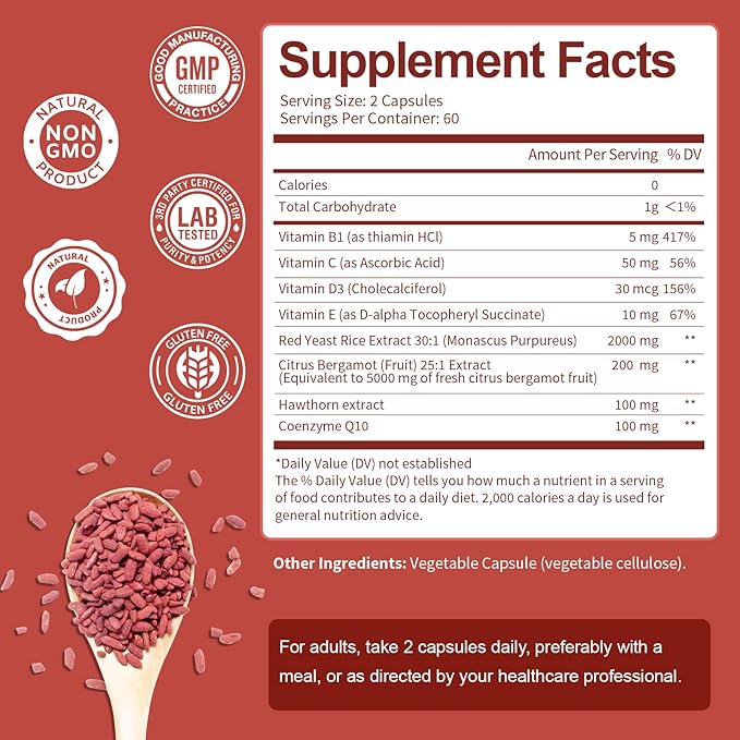 - Better than Other Brands - Our red yeast rice with CoQ10 supplement contains 2000mg of red yeast rice, 100mg of coenzyme q10, 200mg of citrus bergamot, 100mg of hawthorn, and 65mg of multi-vitamins in each serving to help maximize support your heart and body's health.