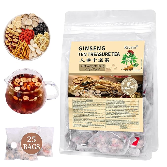 25Pcs Ginseng Ten Treasures Tea, Chinese Traditional Kidney Care Herbal Tea, Natural Kidney Cleanse Detox Tea for Women & Men, 10 Precious Ingredients Formula(25Bags, 300g)
