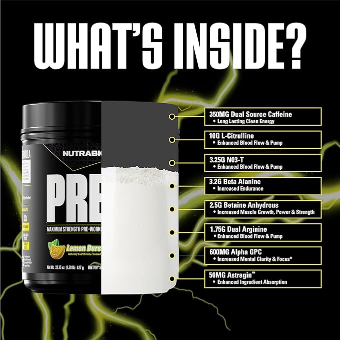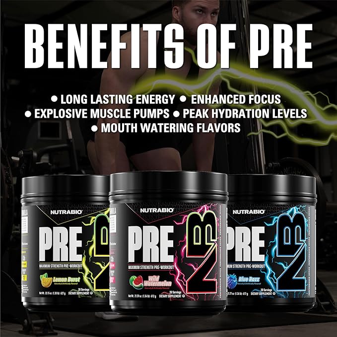 - EXPLOSIVE ENERGY, LASER FOCUS, EXTREME PUMPS: NutraBio’s Newest and most powerful PRE Workout Formula Ever for Both Men & Women. PRE features a dual Caffeine blend delivering fast-acting and long lasting energy, while Tyrosine, Dual Choline Sources, Vincamine, and Velvet Bean Extract sharpen focus and enhance mood, pushing you through every rep.