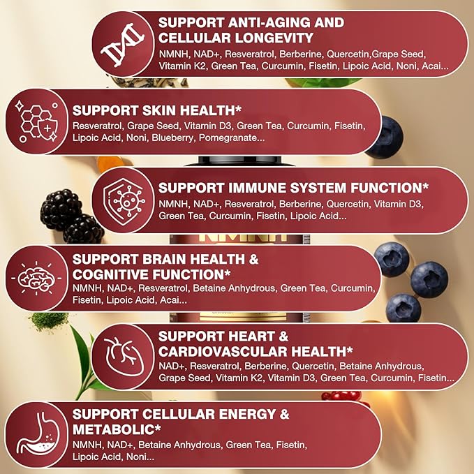 - 19-In-1 Advanced Formula - Our NAD+ resveratrol supplement features a powerful blend of 19 ingredients. This unique NMNH formula helps support healthy aging and cellular health with 100mg of NAD+ and 250mg of Quercetin. It supports brain health with antioxidants like resveratrol and lipoic acid, helping maintain cognitive well-being. The formula helps support immune health with vitamin D3, curcumin, and fisetin, while promoting overall heart health with berberine, vitamin K2, and pomegranate