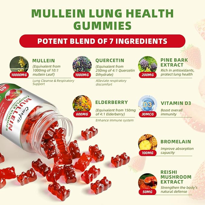 - Mullein Leaf Extract for Lungs– Each Catfit Mullein Gummy contains premium Mullein leaf extract, delivering exceptional lung support. Compared to traditional Mullein drops, Mullein gummies for lungs combine Quercetin and Elderberry extract, providing comprehensive respiratory support to clear airways and boost immunity