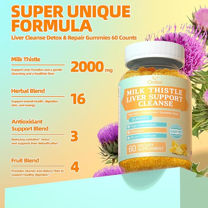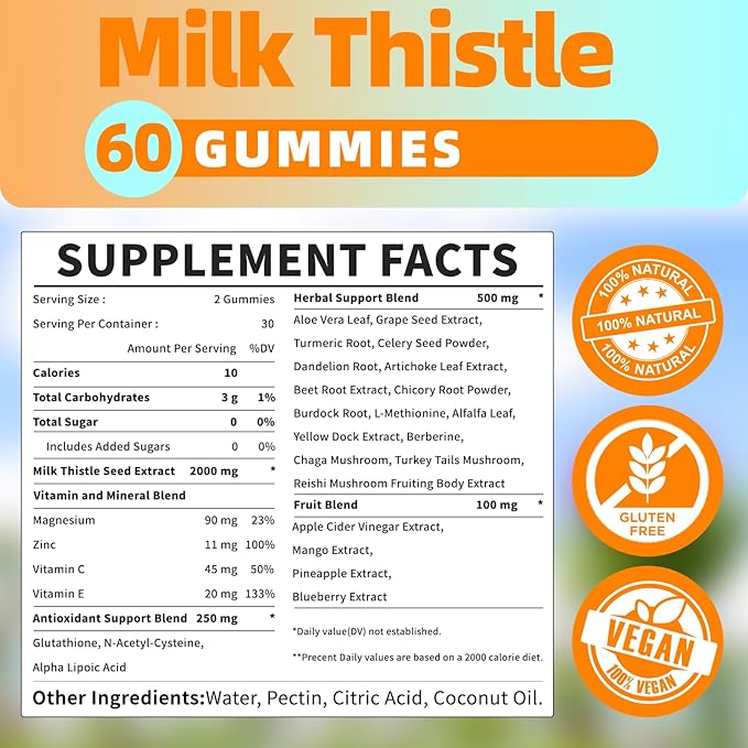 - The Ultimate Liver Support* - 2000mg Milk Thistle & 16 Herbal Extracts - Packed with 2000mg of premium Milk Thistle and a powerful blend of 16 natural herbs and fruits extract—including Turmeric Root, Dandelion Root, Grape Seed Extract, and more—our gummies provide unmatched support for your liver*’s detox* enzyme* system, promoting optimal liver* health and detoxifi cation*