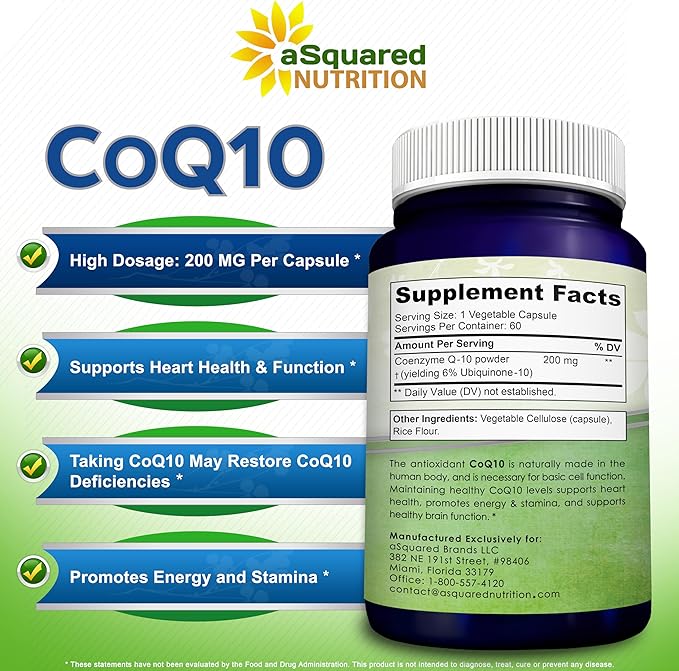 aSquared Nutrition CoQ10 200mg - 60 Capsules - CO Q 10 Supplement - Coenzyme Q10 Ubiquinone Pills - Vegan CoQ-10 Extra Antioxidant Vitamin - Alternative to Softgels & Gummies